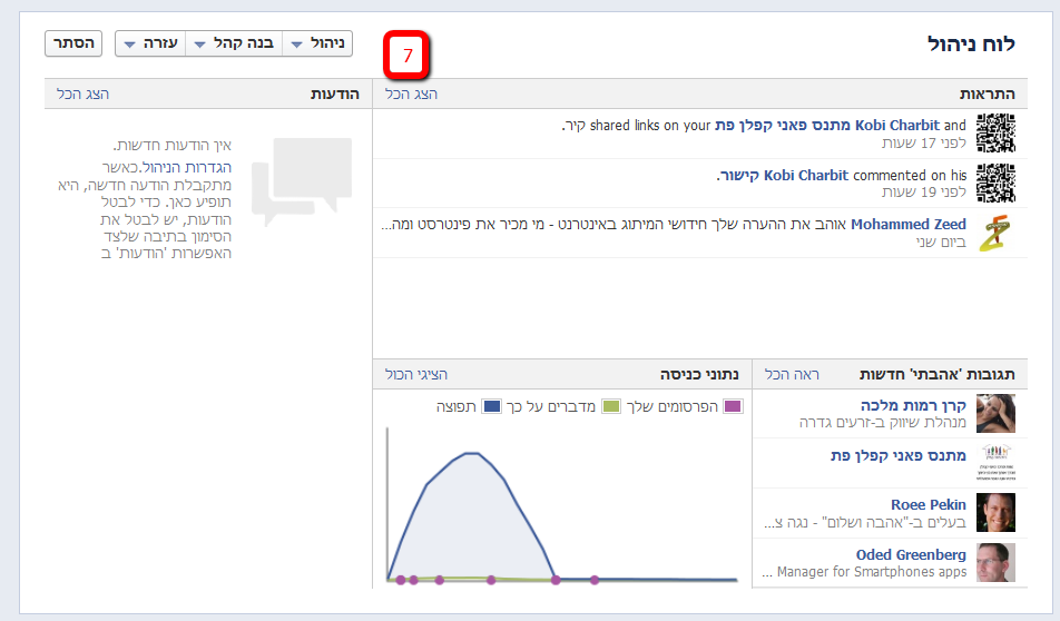 (7) ממשק הניהול של דף האוהדים – כפתור הניהול נמצא בחלקו העליון של דף האוהדים. ממשק הניהול מאפשר צפייה מהירה בפעילות בדף, ניתן לראות באופן חזותי ונוח את הסטטיסטיקה של הפעילות בדף, לראות אילו סטטוסים מעניינים ביותר ומעוררים תגובות וויראליות, מי הקהל שמגיע לדף האוהדים ובהתאם לכך לטייב את התכנים במידת הצורך.