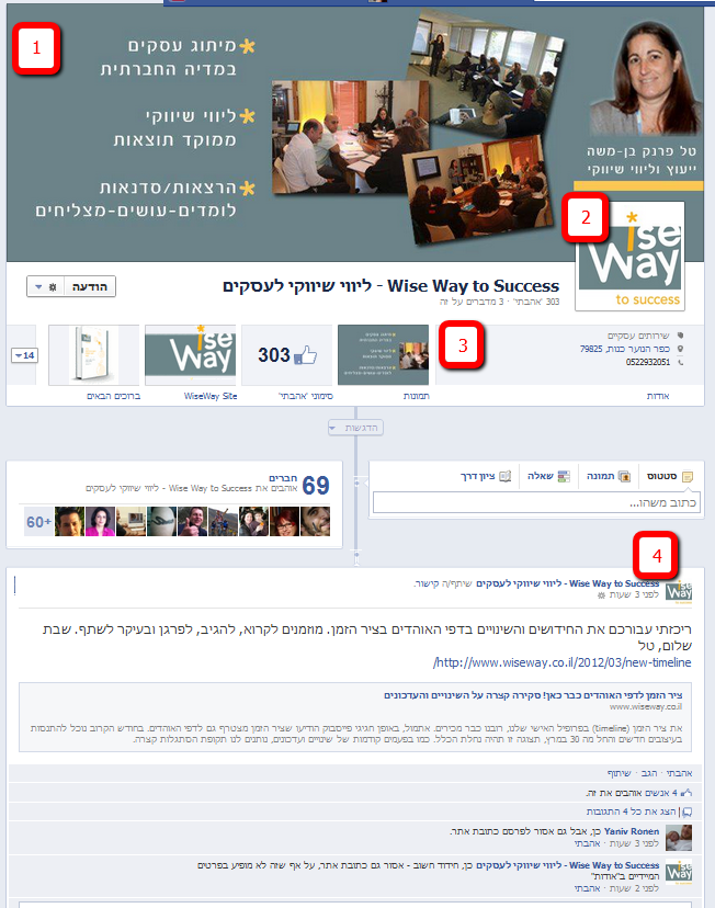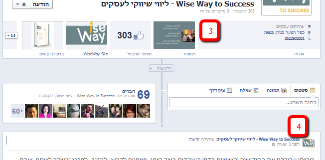 (4) ניהול הסטטוסים – בדומה לפרופיל האישי, גם כאן אנחנו יכולים לנהל את תצוגת התכנים בציר הזמן. ניתן “לנעוץ” סטטוסים חשובים ובכך להשאירם עד 7 ימים בתצוגת ציר הזמן, נעיצה זו למעשה מסמלת שההודעה היא חשובה ומגדילה את הסיכוי לחשיפת המידע לגולשים. כמו כן, ניתן להסיר או להסתיר מתצוגה את הסטטוסים שאנו לא רוצים להראות. אחד היתרונות בתצוגת ציר הזמן הוא בתצוגה גדולה של תמונות בסטטוסים, אפשר בהחלט להשתמש בתמונות להנעת הגולשים לפעולה מסוימת. חישבו יצירתית וצרו תמונות משולבות במסרים שיווקיים, כדי לקדם פעילויות ומוצרים שלכם ברשת.